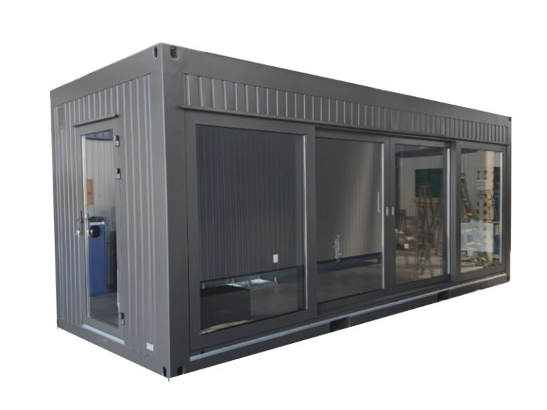 Le Bureau Bulle de Vente PRO-CONTAINER® est une unité de travail mobile haut de gamme utilisant un système de panneaux amovibles et interchangeables. Sa configuration panoramique avec une façade largement vitrée est spécifiquement conçue pour les showrooms, les points de vente immobiliers et les bureaux de réception.